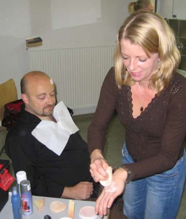 |  | Andi in der Maske (links), Carina macht die Maske (rechts) |  | Hausmeister Peter Arnheim hat die Saalanlage im Schummerlichtblick |  | |  | Backstage 90 Sekunden vor Beginn