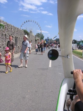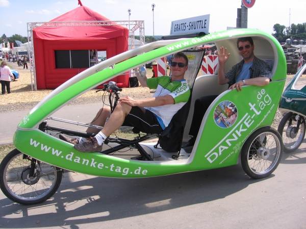 Die Luft in den Zeltpavillons ist bei Sonnenschein geradezu unerträglich, deshalb habe ich mir ein wenig Bewegung an frischer Luft verdient und besteige daher eines dieser Bike-Taxis.